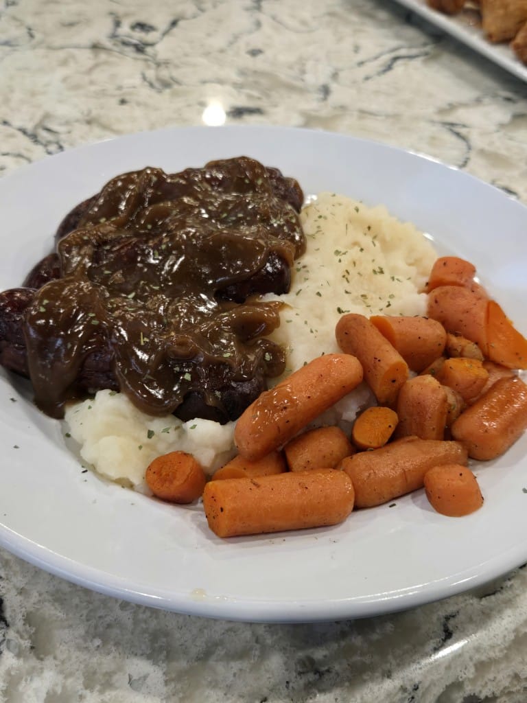 Now onto the food: the bangers and mash — my $17.99 plate of Irish-style sausage, rich onion gravy, creamy mashed potatoes and carrots. A hearty plate. I haven’t been back to Ireland since 2020. Bangers and mash is not just comfort food for me, it’s heritage. It’s rainy afternoons on the central west coast of Ireland. It’s pubs in Galway where conversations linger and Guinness settles slowly. Bangers and mash is as quintessential to Ireland as Peaches are to Georgia.