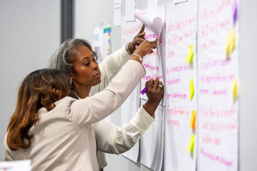 Among the thoughts added to the board were concerns about losing local pre-K programs and the cost of transportation. Someone also noted the benefits that come with proximity to services for students, such as after-school and health care programs.