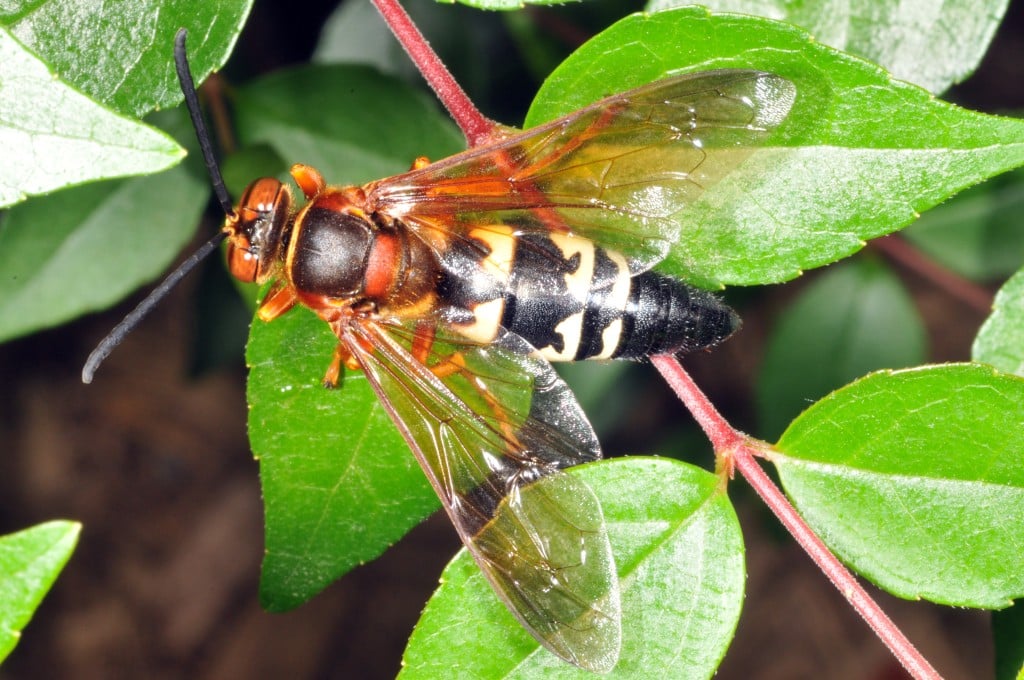 As their name suggests, this wasp species hunts cicadas. Cicadas are captured mid-flight and paralyzed by the venom of the wasp’s sting — no small feat given the cicada’s size. The immobilized cicada is hauled to the bottom of the burrow, where it will serve as provisions for the wasp larva before it pupates and emerges the following summer.