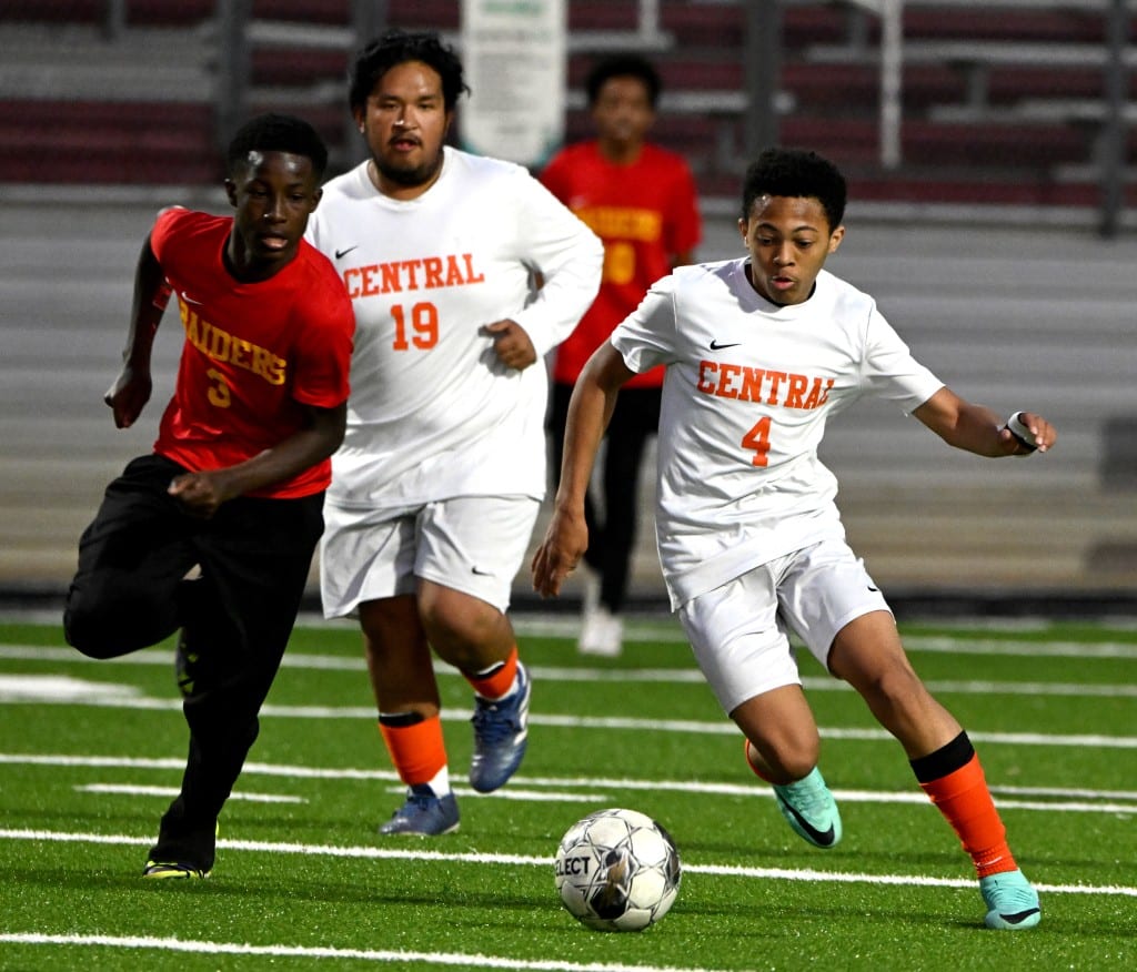 Central’s Javon Hodges (4) dribbles past aNortheast defender during the Chargers’ 10-0 win over the Raiders Tuesday night. Jason Vorhees / The Melody