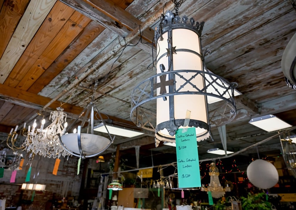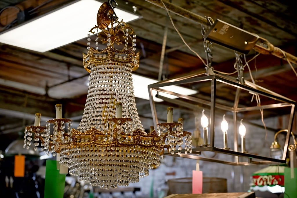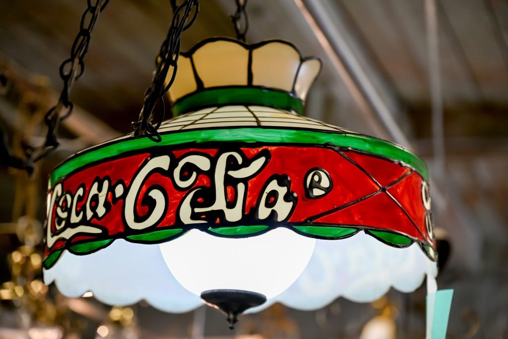 Chandeliers, lamps and other unique light fixtures hang from the ceiling at the entrance to the flea market warehouse. Ahead of the market’s opening, Boone repairs any broken lamp parts, including replacing missing crystal pieces. There’s a light fixture to match every style — from a vintage Coca-Cola stained glass lamp to a Gothic cathedral lantern and a gold-accented chandelier with hundreds of cascading crystals.