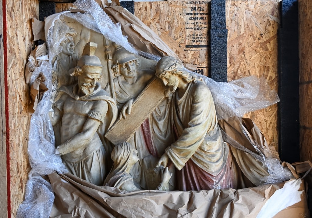 Several pieces were salvaged from a cathedral in the northeast that was set to be demolished. Historic Macon received part of a stone relief from the cathedral that depicts Saint Veronica wiping the face of Jesus, who holds part of the Cross.