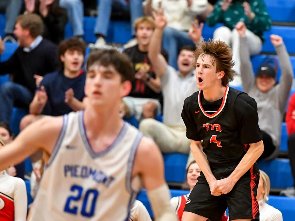 An electric third quarter made it look like the Vikings would advance to the championship. FPD outscored the Cougars 22-7 in the period using five 3-pointers, including two apiece from star shooters Brett Roper and Breck Griffin. FPD had an 8-point lead at one time, mirroring Piedmont’s advantage earlier. The Vikings fans got louder and louder with each made basket, and the players celebrated after shots from long range.