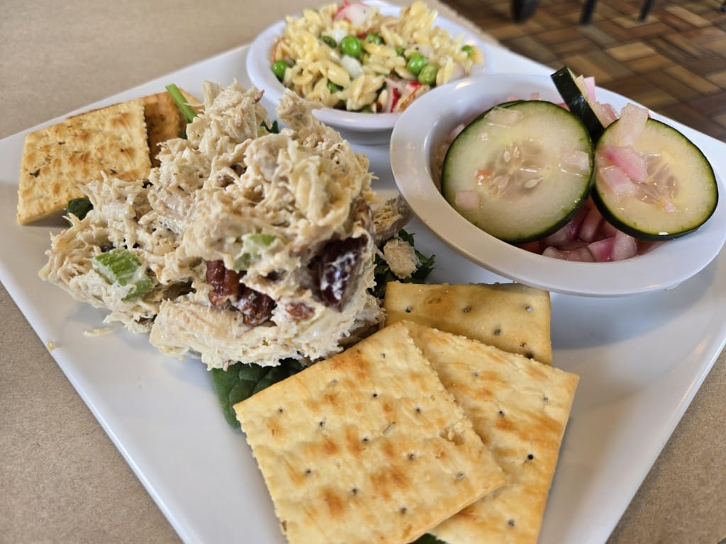 I ordered The Cold Plate Combo and it offered a more personal experience. Mom’s Chicken Salad, served over greens alongside cucumber salad and a pea and orzo salad with brown butter saltine crackers, carries a story with it. Saralyn shared that the recipe came from her mother, who passed away last October. It is a dish that feels as comforting as it is flavorful, a reflection of both memory and tradition. Mom’s Chicken Salad is the owner’s favorite menu item and it’s available on all four seasonal menus.