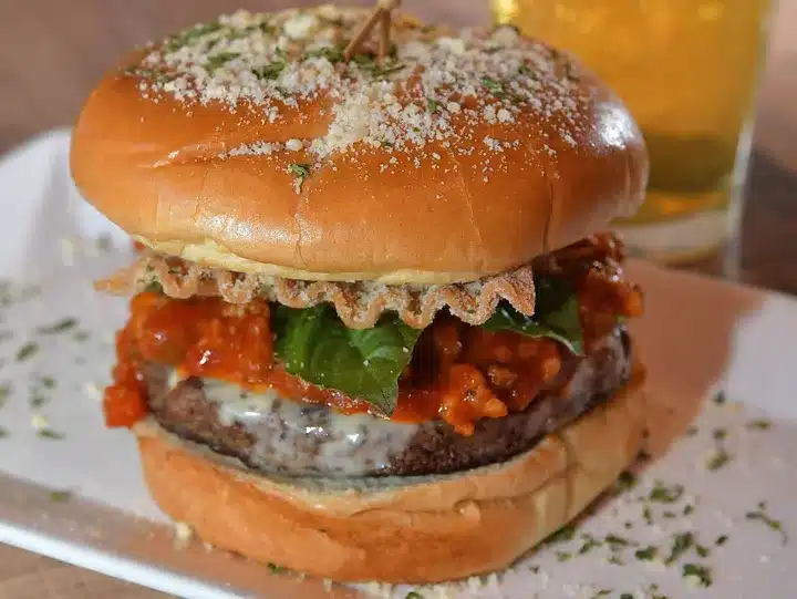 Italian Seasoned Short-Rib Patty Topped With Mozzarella Cheese, A Sweet Italian Sausage Red Sauce, Fresh Basil, & Fried Lasagna Chips Tossed In Grated Parmesan On A Garlic Butter Toasted Bun.