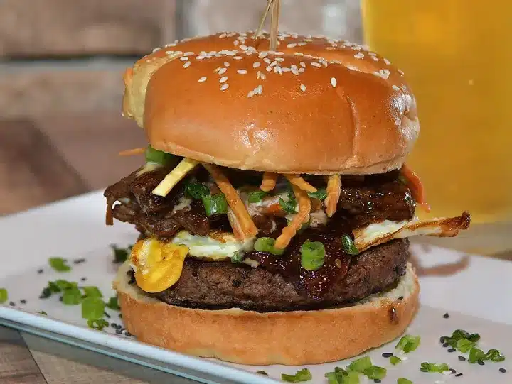 Short-rib brisket patty topped with Korean beef bulgogi, kimchi, fried egg, crispy wonton straws, and a sweet and spicy yum yum sauce