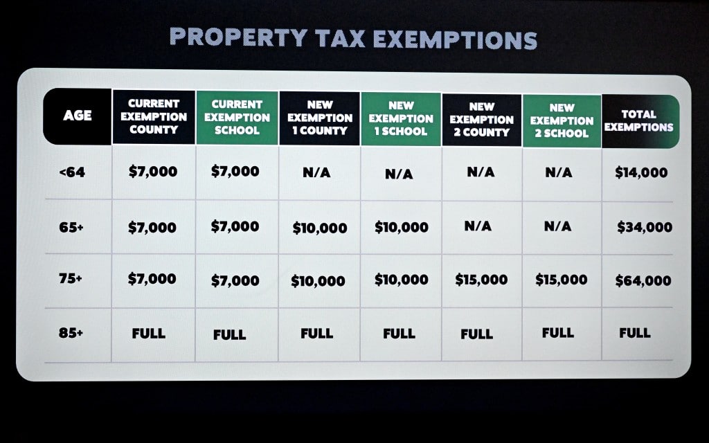 For residents 65 and older, the proposal would allow up to $34,000 in county and school district tax breaks, Miller said. Residents 75 and older would be eligible for a $64,000 property tax break.