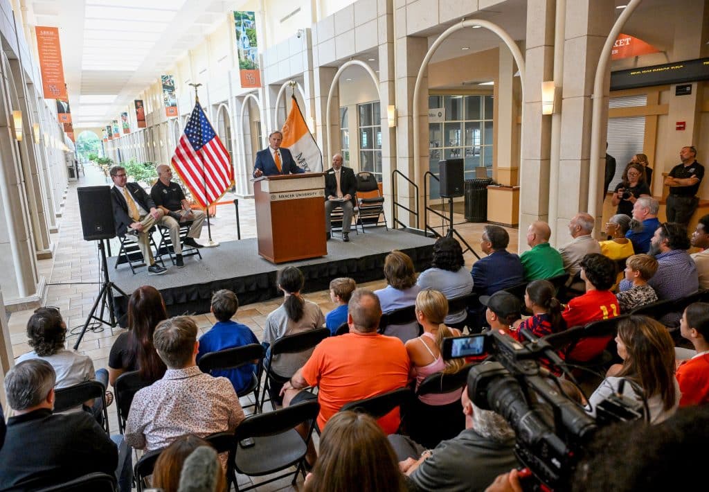 Mercer athletic director Jim Cole speaks to a large crowd of fans, employees and media in Mercer’s Heritage Hall at University Center. Jason Vorhees / The Melody