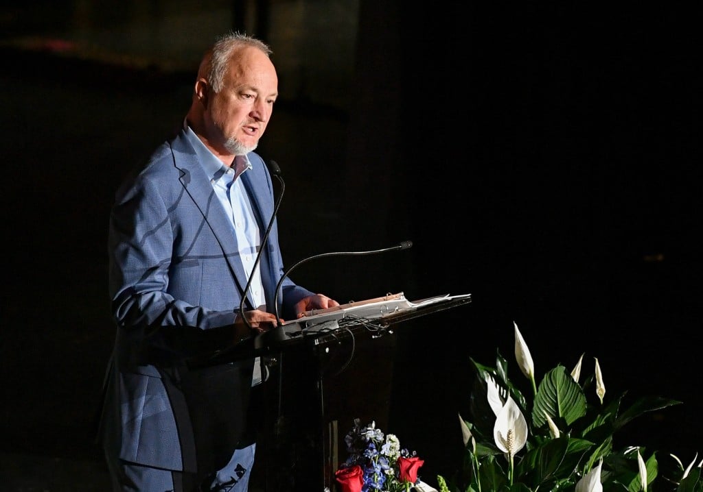 Mayor Lester Miller speaks at the Greater Macon Chamber of Commerce’s State of the Community. Miller touted completed projects like the amphitheater and Rhythm and Rally pickleball center while also previewing coming projects like road improvements and the new coliseum. Jason Vorhees / The Melody.