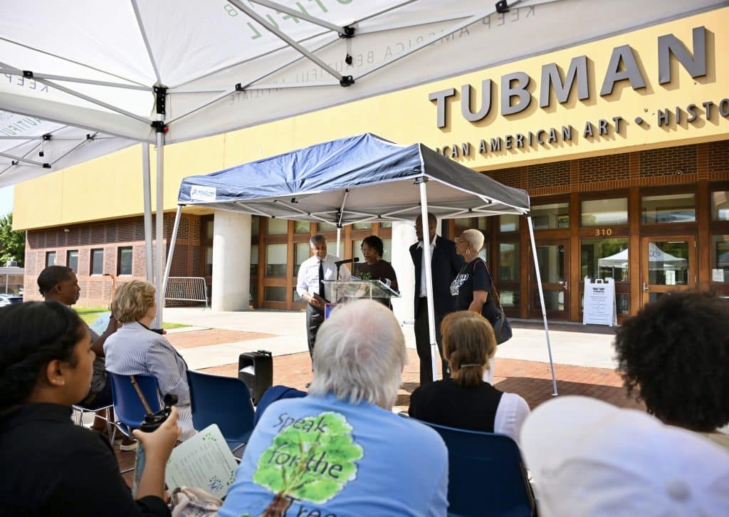 The hot air steamed a group of local officials and community members shaded under tents outside the Tubman Museum in downtown Macon. Many were sweating, fanning themselves and drinking water.