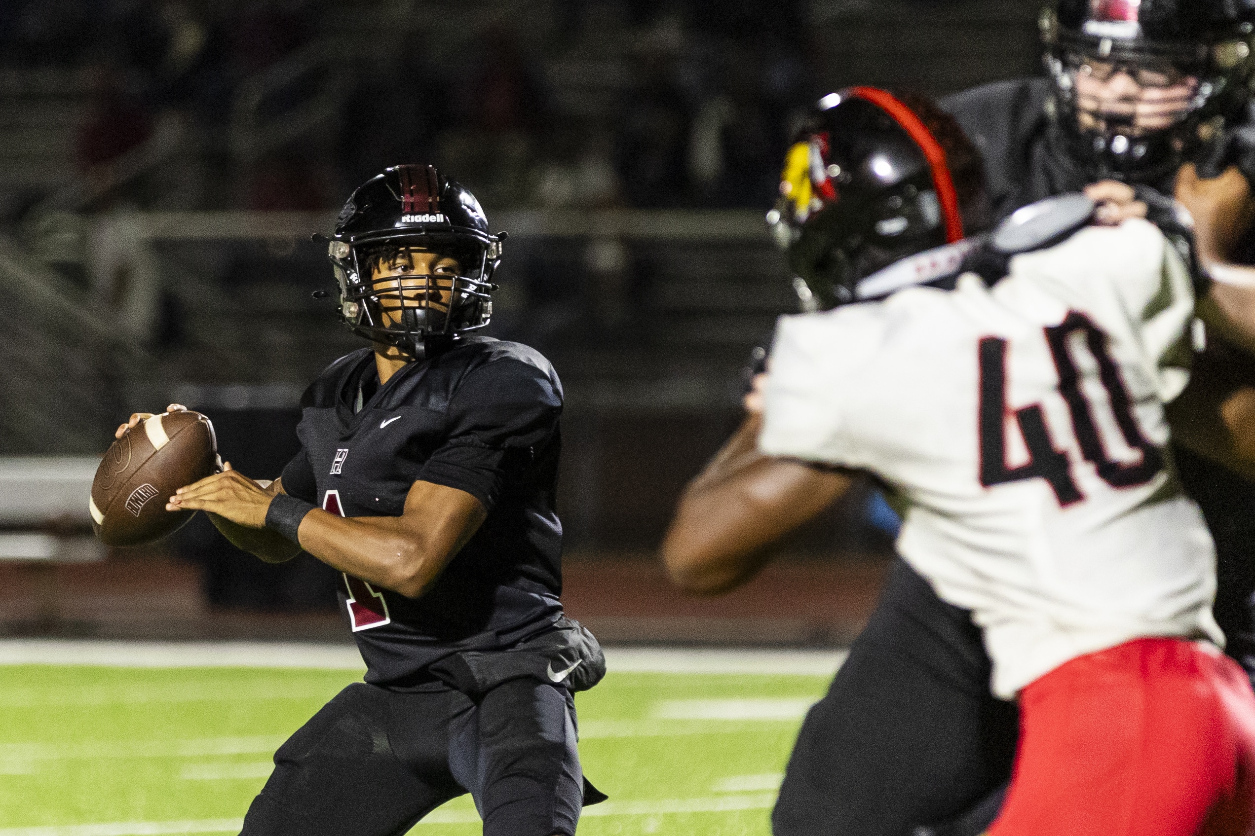 Howard quarterback Deon Wellons (1) looks to pass during a game against Baldwin at Thompson Stadium in Macon, Georgia, on Thursday, Oct. 31, 2024. (Jessica Gratigny / For The Melody)