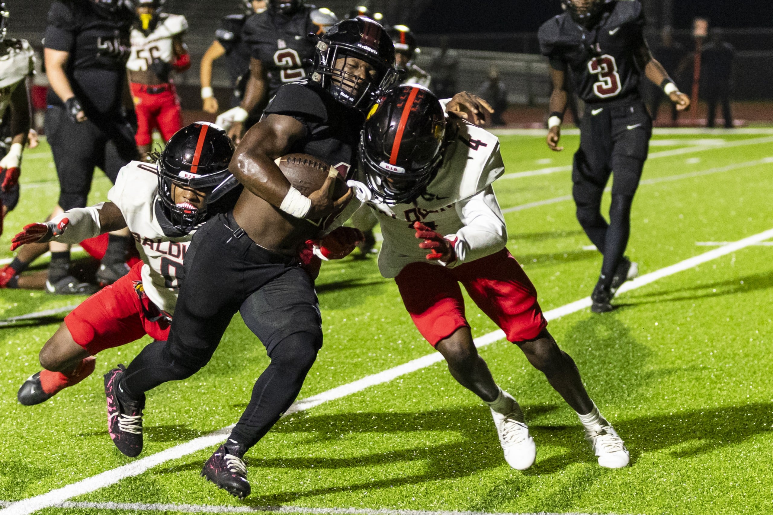 Howard’s running back Jacolbie Allen (16) is tackled by Baldwin’s outside linebacker Devarious Russell (0) and defensive back London Blash (4) at Thompson Stadium in Macon, Georgia, on Thursday, Oct. 31, 2024. (Jessica Gratigny / For The Melody)