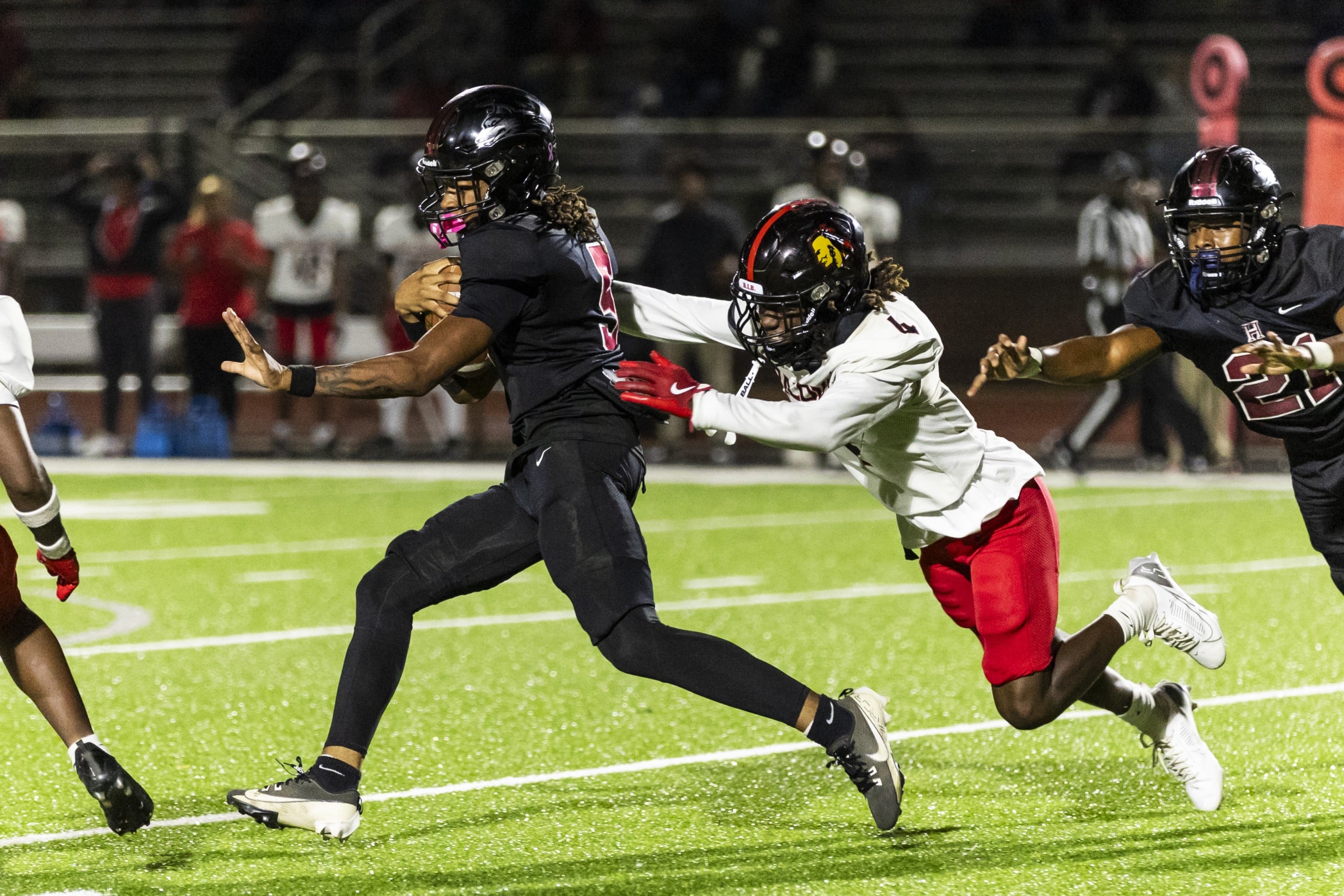 Howard free safety Ta’Shawn Poole (5) runs the ball while evading a tackle by Baldwin defensive back London Blash (4) during a game at Thompson Stadium in Macon, Georgia, on Thursday, Oct. 31, 2024. (Jessica Gratigny / For The Melody)