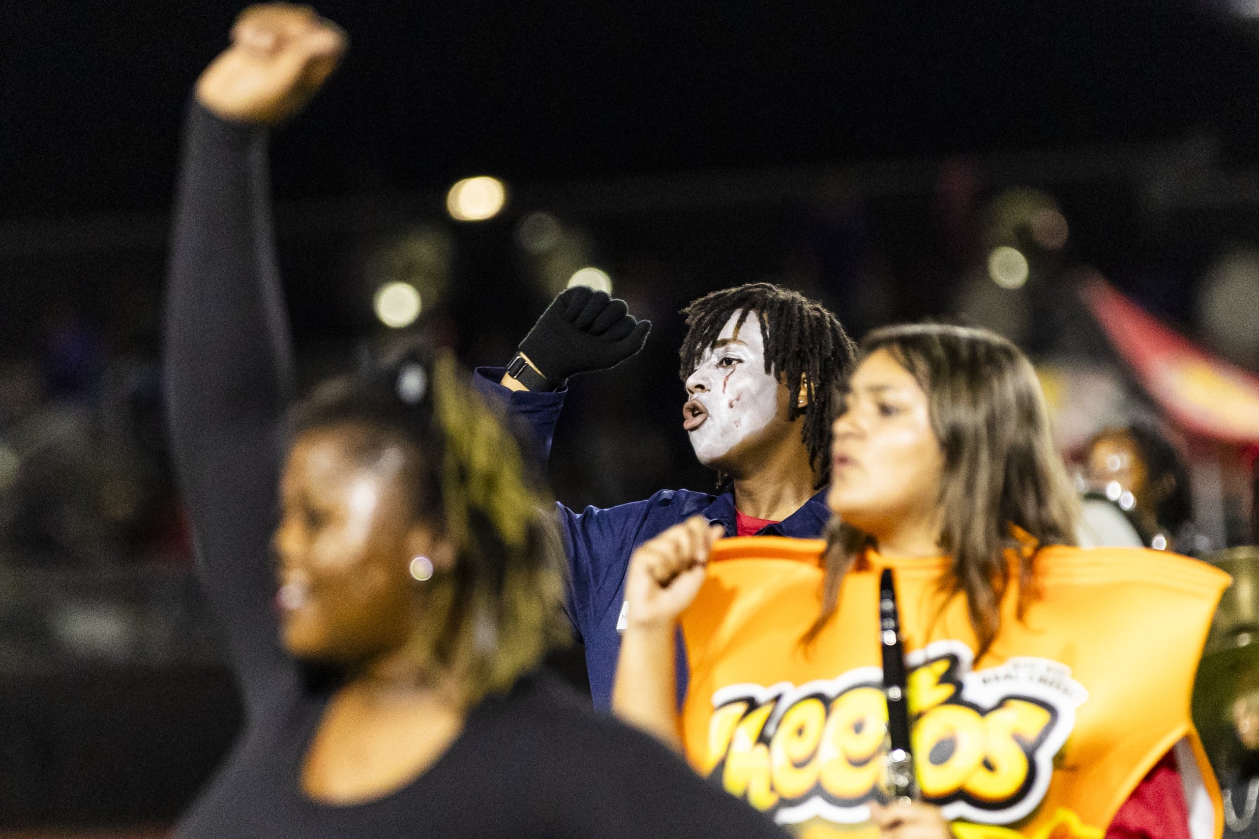 The Howard High School marching band performs in Halloween costumes during halftime at Thompson Stadium in Macon, Georgia, on Thursday, Oct. 31, 2024. (Jessica Gratigny / For The Melody)