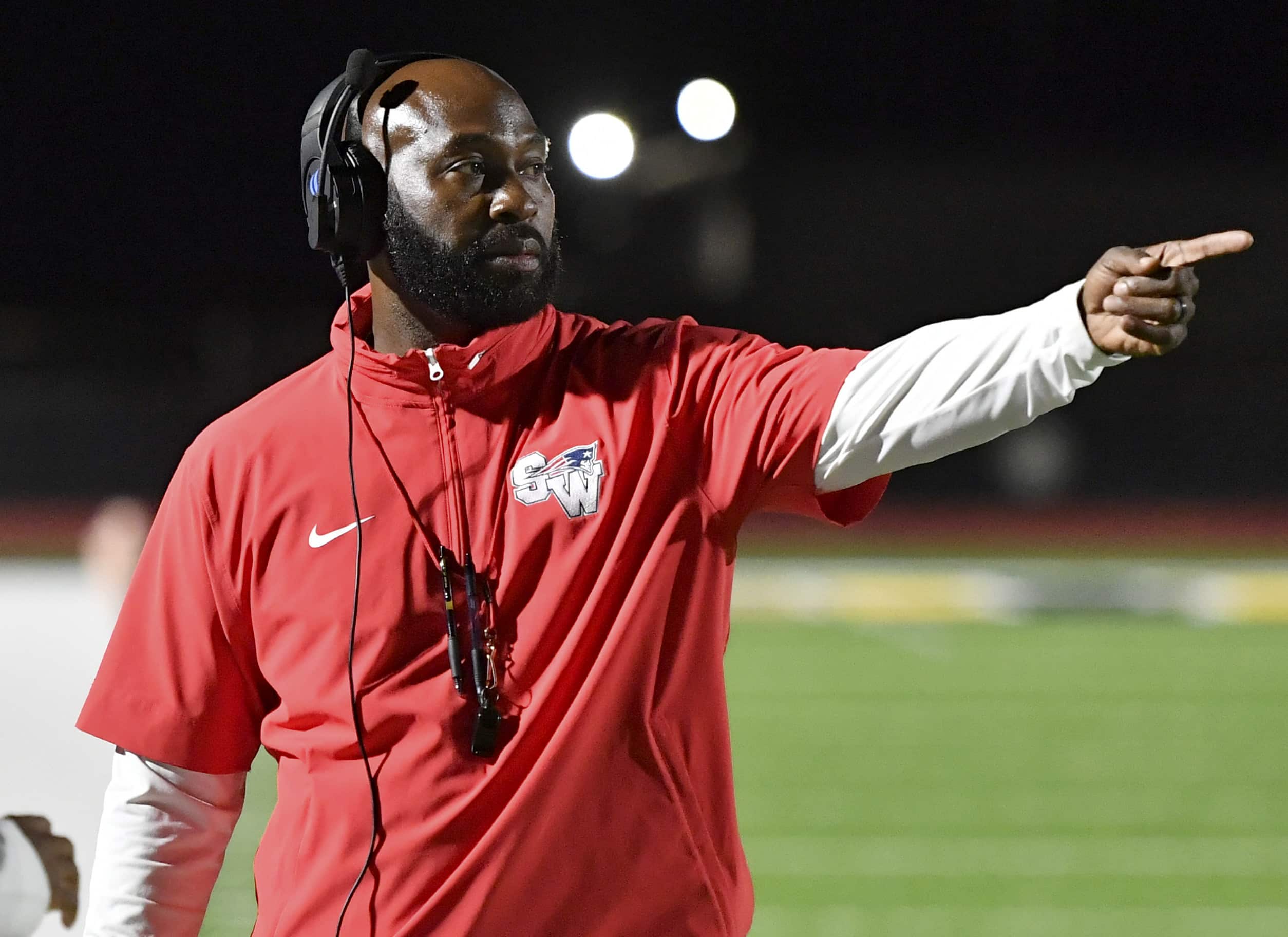 Howard head coach Jessie “Trey” Porter III shouts to his players from the sidelines during a game against Baldwin at Thompson Stadium in Macon, Georgia, on Thursday, Oct. 31, 2024. (Jessica Gratigny / For The Melody)