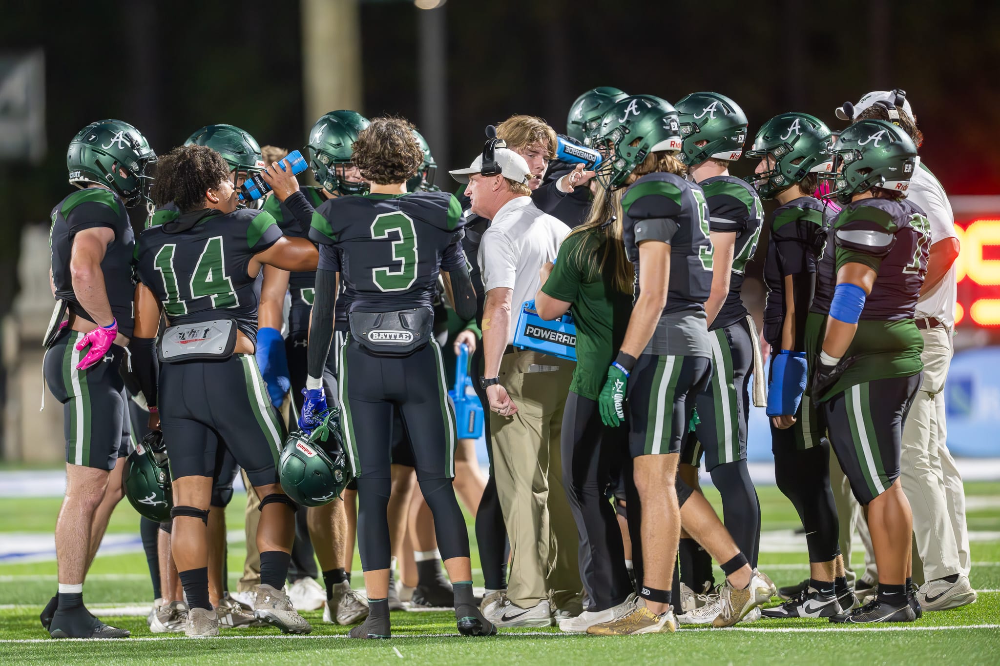 The ACE Gryphons fell to Washington County 14-17 to close out the regular season. ACE coach Keith Hatcher huddles during a timeout.