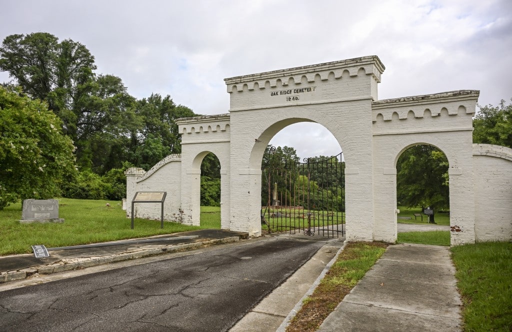 A long stretch of seemingly empty terraces, Oak Ridge is situated just within the Madison Street brick entrance way of the cemetery and runs all the way down to the train tracks by Ocmulgee River. Its absence of monuments or other markers, save for a few crumbling bricktop tombs or faded headstones, is a stark contrast to the busy array of limestone, marble and granite monuments sprinkled throughout Rose Hill.