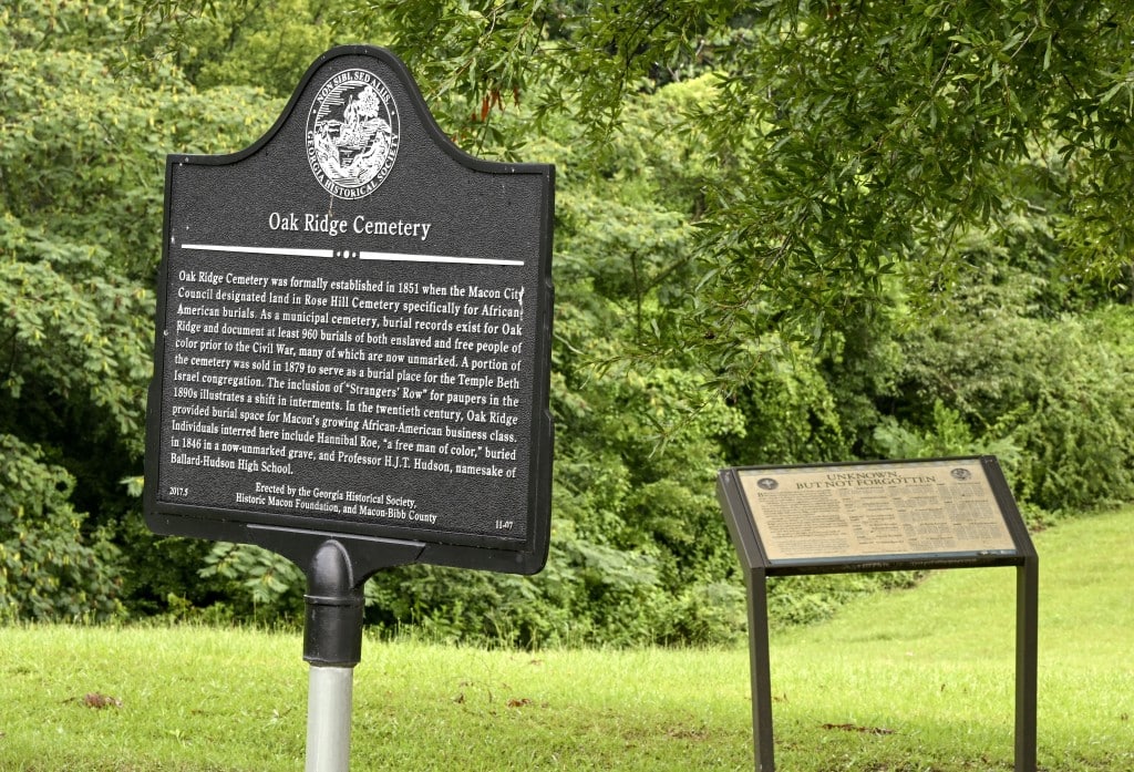 A few well-known Black families in Macon are buried near the front of Oak Ridge, including the Hutchings family who opened a successful funeral home in 1895. The prominent family rebuilt the business, named C.H. Hutchings and Son, in 1927, and it is still open today at 536 New St. The Hutchings family is memorialized by well-kept stone markers in a terraced area surrounded by brick fencing.