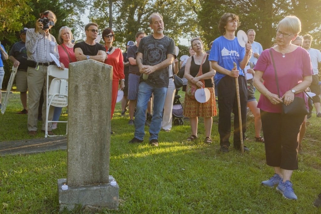 Around 60 people attended the twilight tour of Oak Ridge, many donning Rose Hill preservation T-shirts and waving paper fans to stay cool in the evening heat.