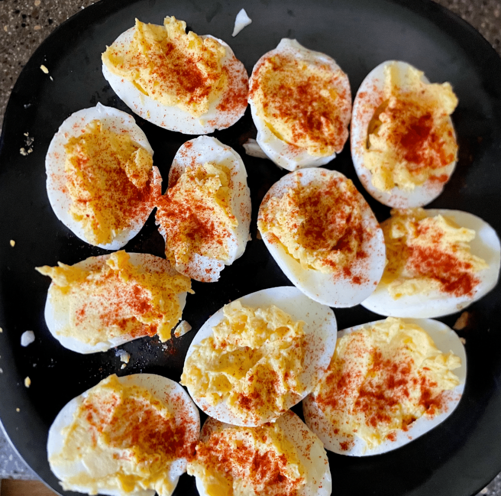 Halve each hard boiled egg the long way and scoop out the yolks. Set the whites aside and mash the yolks in a bowl with a fork. Add the rest of the ingredients and mix thoroughly. Use either a spatula or a frosting bag to fill each egg white with a dollop of yolk. Sprinkle with extra paprika for a pop of color and enjoy!
