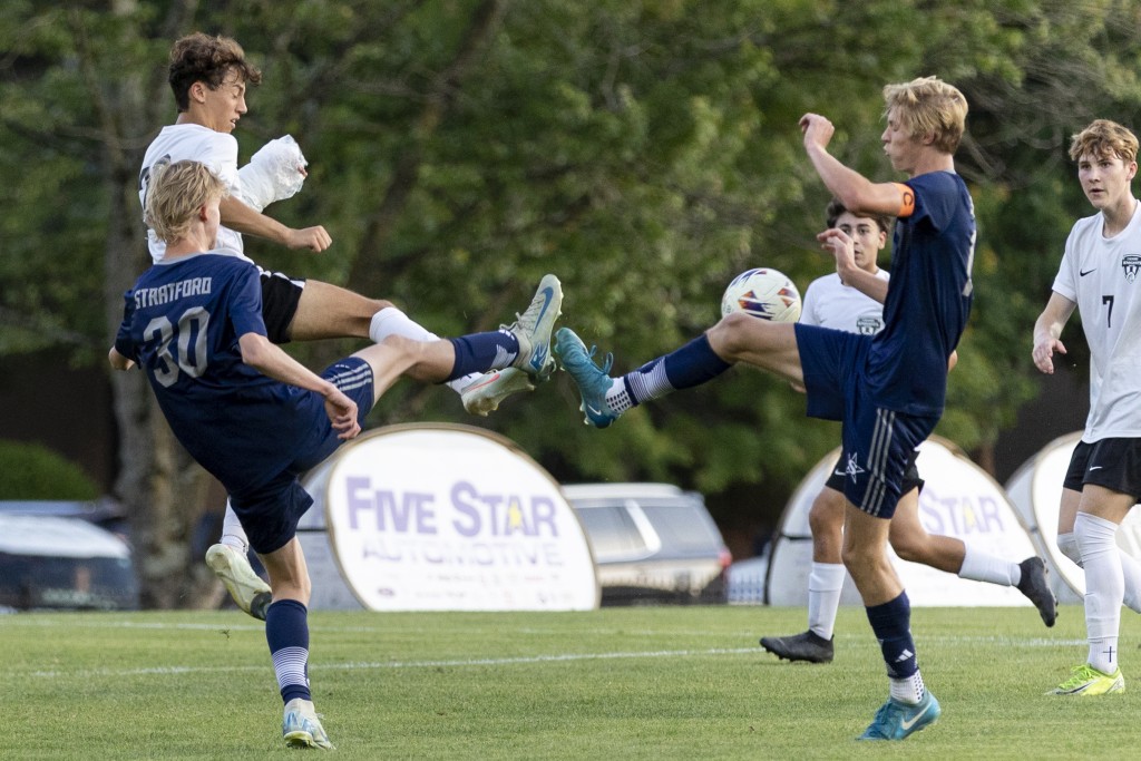 Stratford’s Auden Geary (30) and Wes Flournoy (15) compete with Calvary Christian’s Matthew Ramirez (22) for the ball during a GIAA playoff game on Thursday in Macon. The Eagles defeated the Knights 1-0. (Jessica Gratigny / For The Melody)