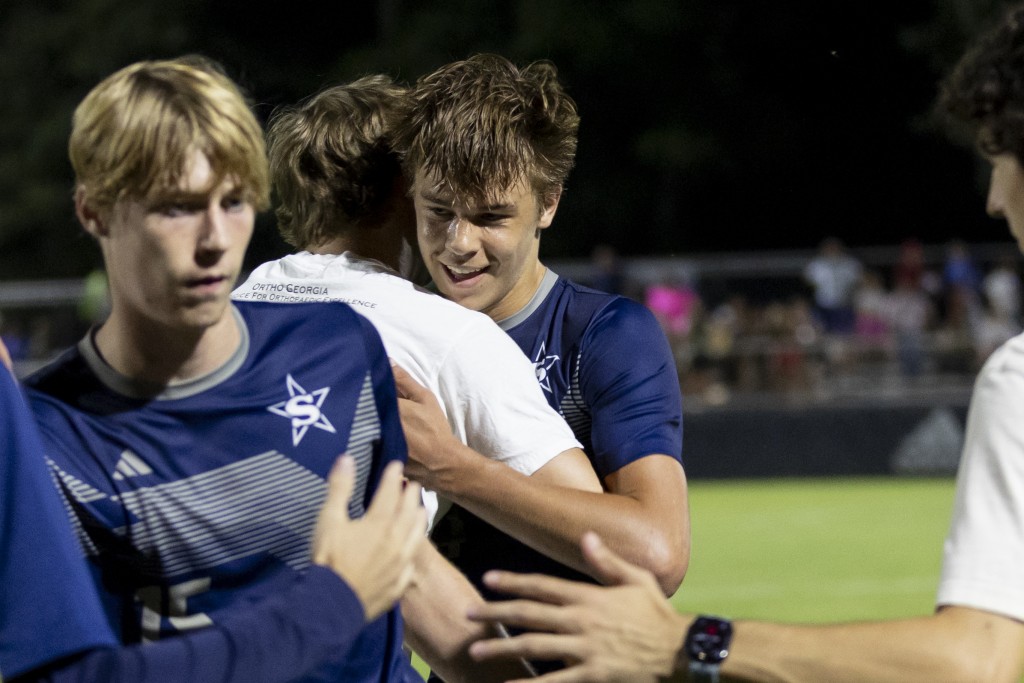 Stratford’s Brady Flournoy (24) hugs friends after scoring the game-winning goal during a GIAA playoff game against Calvary Christian School on Thursday. The Eagles defeated the Knights 1-0. (Jessica Gratigny / For The Melody)