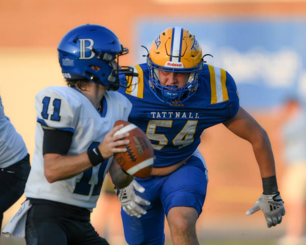 Tattnall middle linebacker Anson Talcott (54) pressures Brookstone quarterback Carson Lott during the Trojans’ opening game Friday night. Tattnall would go on to lose the game 26-15. Donn Rodenroth / For The Melody